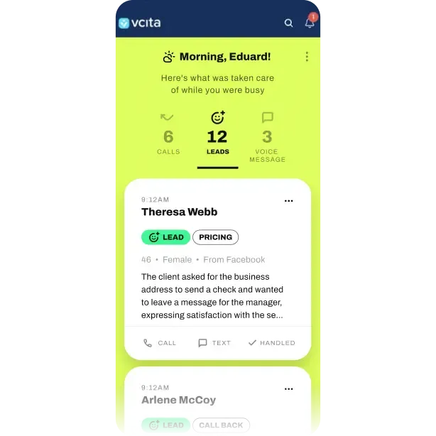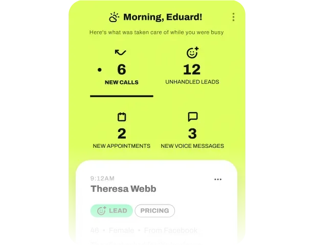messages at a glance, with transcribed messages and smart tags. Take immediate action—call back, text, or mark leads as handled—directly from the app, ensuring nothing slips through the cracks.